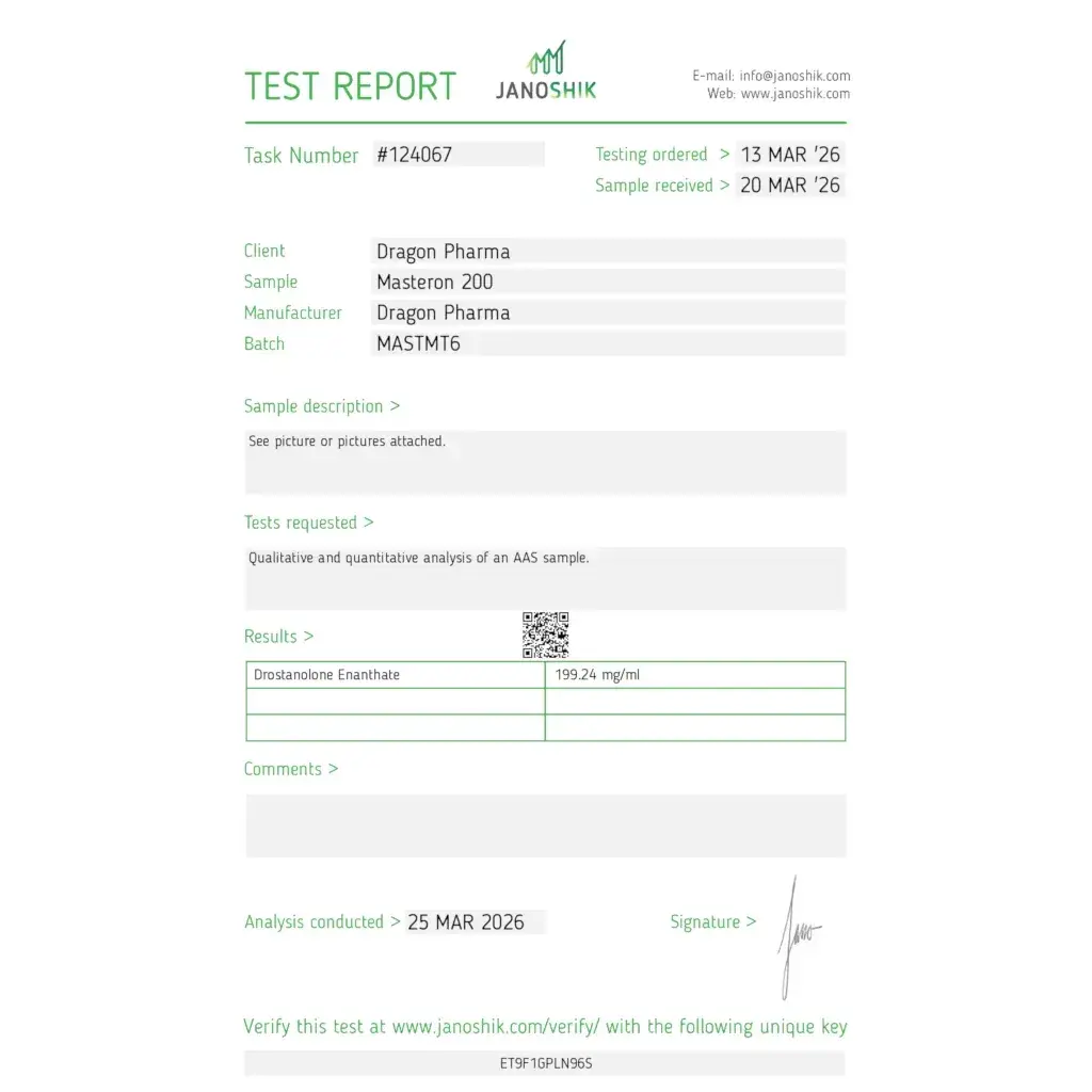 Masteron 200 by Dragon Pharma contains 200 mg/mL of drostanolone enanthate in a 10 mL multi-dose vial, commonly used in cutting cycles to enhance muscle hardness, definition, and overall physique conditioning.