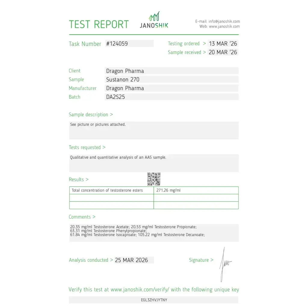 Sustanon by Dragon Pharma contains a sophisticated blend of five testosterone esters (Acetate, Propionate, Phenylpropionate, Isocaproate, Decanoate) at 270 mg/mL in a 10 mL multi-dose vial. This multi-ester formula provides rapid onset and sustained action, making it ideal for bulking, cutting, and performance protocols.