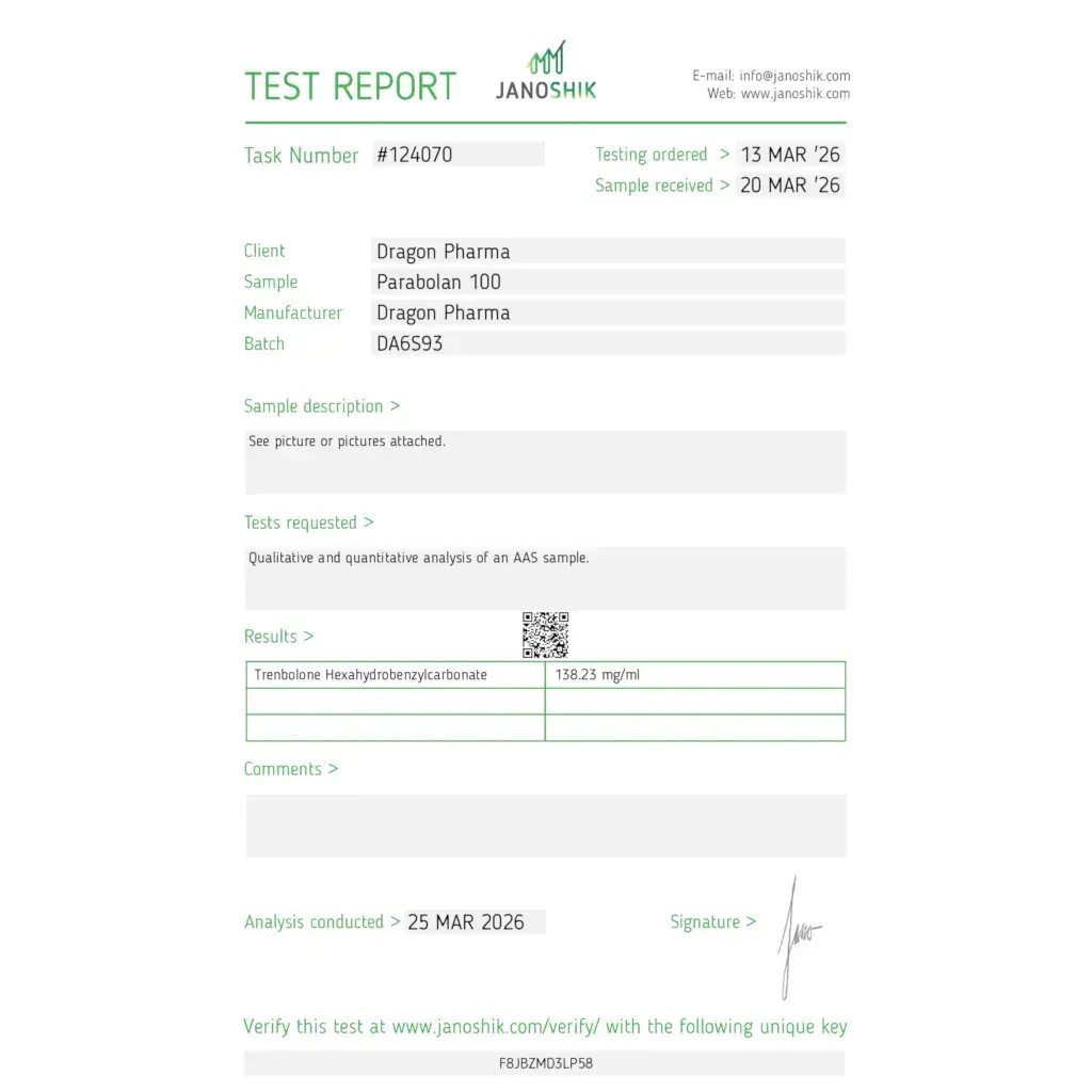 Parabolan by Dragon Pharma contains 100 mg/mL of Trenbolone Hexahydrobenzylcarbonate in a 10 mL multi-dose vial. This premium, original longโacting trenbolone ester is prized for extreme hardness, lean mass, and strength without water retention.